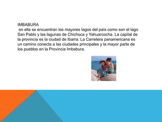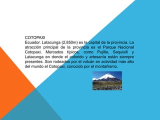 La provincia de Cotopaxi tiene como atracción principal el Parque Nacional Cotopaxi, que rodea al volcán Cotopaxi. Los mercados de Pujilla, Saquisilí y Latacunga ofrecen artesanías y colorido. Imbabura contiene los mayores lagos del país como San Pablo y Chichoca. Su capital es Ibarra y está conectada por la Carretera Panamericana. Chimborazo se encuentra el volcán más alto del Ecuador y da nombre a la provincia. Su capital es Riobamba. Carchi limita con Colombia