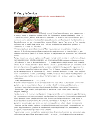 Los documentos proporcionan información sobre maridajes exitosos entre vinos y alimentos. Explican que el objetivo del maridaje es potenciar los sabores del vino y la comida sin que ninguno opaque al otro. Se discuten diferentes tipos de maridaje como el complemento y el contraste. También se analizan cómo las características de los vinos como el tanino, dulzor y acidez interactúan con diferentes alimentos. Se ofrecen ejemplos de maridajes clásicos y se advierte sobre alimentos que interfieren con el vino.