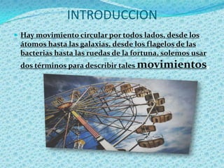 Este documento trata sobre conceptos relacionados con el movimiento circular y angular. Explica cómo se mide el ángulo y la velocidad angular, así como la aceleración centrípeta y angular. También describe la ley de la gravedad de Newton y las tres leyes de Kepler sobre los movimientos de los planetas.