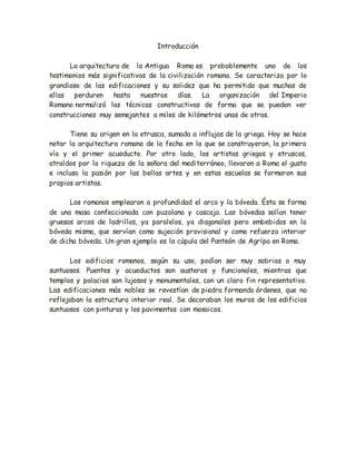 La arquitectura romana se caracterizó por lo grandioso y sólido de sus edificaciones, muchas de las cuales perduran hoy en día. Los romanos desarrollaron técnicas constructivas normalizadas que permitieron construcciones similares en todo el Imperio. Utilizaron profundamente el arco y la bóveda, como en la cúpula del Panteón. Sus edificios variaban desde austeros puentes y acueductos hasta lujosos templos y palacios decorados con pinturas y mosaicos. La arquitectura romana