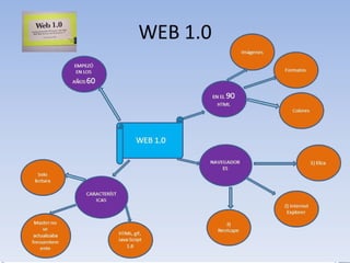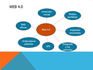 El documento describe la evolución de la web desde la Web 1.0 hasta la propuesta de Web 4.0. Explica que la Web 1.0 consistía principalmente en contenido estático, mientras que la Web 2.0 introdujo blogs, wikis y redes sociales para permitir la colaboración entre usuarios. La Web 3.0 se centra en aplicaciones basadas en la nube y el acceso multiplataforma. Finalmente, la Web 4.0 propone una interacción más personalizada con el usuario a través de soluciones inteligentes.