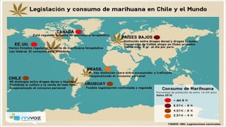 Este documento presenta información sobre partes del cerebro involucradas en la adicción y efectos de la marihuana, como también sobre un grupo de estudiantes que solicita un permiso para cultivar marihuana con fines de investigación en Chile. Finalmente, resume el proceso de legalización de la marihuana en Uruguay en 2013.