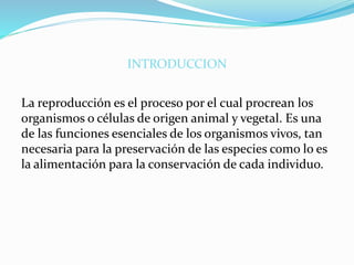 La reproducción sexual y asexual son procesos importantes para la preservación de las especies. La reproducción sexual involucra la fusión de gametos masculinos y femeninos y produce variabilidad genética, mientras que la reproducción asexual no involucra gametos y los nuevos organismos son genéticamente idénticos al organismo original. Ambos procesos son esenciales para asegurar la continuidad de las especies a través del tiempo.