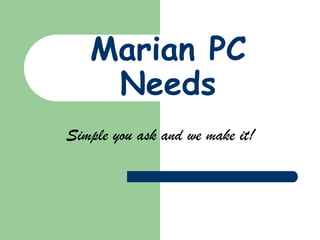Marian PC Needs es una empresa dedicada a brindar servicios de diseño multimedia, diseño web, reparación de PC, e impresión y documentación. La empresa atiende a clientes individuales que necesiten ayuda técnica o servicios de diseño. Los proveedores incluyen empresas como eBay, Omega Tech y Amazon. La empresa opera desde un local en Santo Domingo y cuenta con tres PC, una laptop, dos impresoras y un equipo de cinco personas incluyendo al propietario.