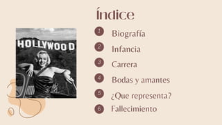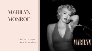Marilyn Monroe tuvo una infancia difícil sin padre y con una madre en un manicomio. Se convirtió en una de las actrices más famosas de Hollywood tras películas como "Los caballeros las prefieren rubias". Se casó tres veces, con James Dougherty, Joe DiMaggio y Arthur Miller, pero los matrimonios fueron problemáticos debido a la fama de Monroe y los celos de sus maridos. Murió en 1962 a los 36 años en circunstancias que aún se debaten.