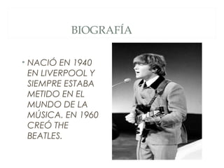 John Lennon nació en 1940 en Liverpool, Inglaterra. En 1960 co-fundó la banda The Beatles y escribió exitosas canciones como "Yellow Submarine", "Yesterday" y "All You Need is Love". En 1969 se separó de The Beatles para iniciar una carrera en solitario junto a Yoko Ono. Desafortunadamente, en 1980 fue asesinado por un fanático cuando ingresaba al edificio Dakota en Nueva York, donde vivía.