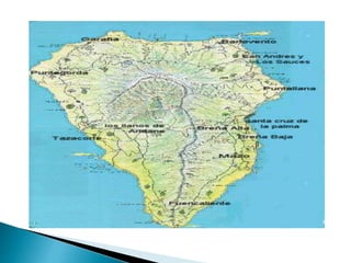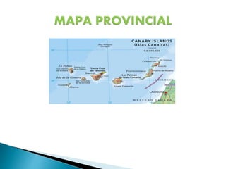 El documento proporciona información sobre las Islas Canarias, un archipiélago español ubicado en el océano Atlántico. Describe las siete islas principales que componen el archipiélago - Tenerife, Fuerteventura, Gran Canaria, Lanzarote, La Palma, La Gomera y El Hierro - así como sus capitales, poblaciones, superficies y características geográficas más destacadas. Además, resume brevemente la geología y origen volcánico del territorio canario.