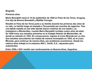 Mario Benedetti nació en 1920 en Uruguay. Vivió sus primeros años en varias ciudades uruguayas antes de mudarse a Montevideo a los 4 años. Estudió de forma incompleta debido a problemas económicos. Tras el golpe militar de 1973 en Uruguay, debió exiliarse en Argentina, Perú, Cuba y España debido a sus posiciones políticas. Fue un destacado escritor y poeta uruguayo, autor de obras como La Tregua y Gracias por el fuego.