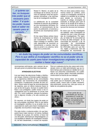 La relación entre saber y poder es compleja. Mientras la ciencia básica busca poder para generar conocimiento, la técnica usa el conocimiento para obtener poder. Sin embargo, a veces los investigadores buscan poder en lugar de conocimiento, sacrificando la calidad de su trabajo. El verdadero investigador usa el poder para hacer descubrimientos originales, no para sí mismo.