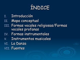 El documento resume las principales formas musicales del Renacimiento, incluyendo música vocal religiosa como el coral y el motete, música vocal profana como el madrigal y la chanson, formas instrumentales como piezas adaptadas de obras vocales y basadas en la improvisación o variación, y los instrumentos musicales y danzas populares de la época como la pavana y la gallarda.