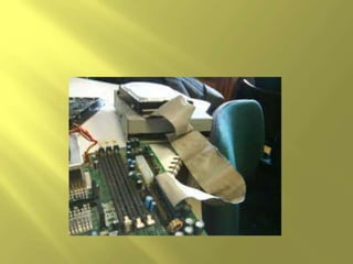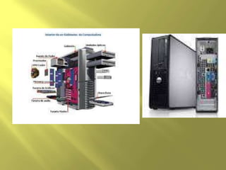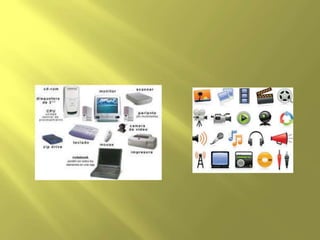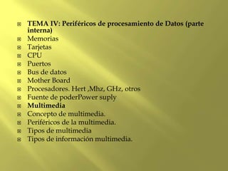 El documento habla sobre periféricos de procesamiento de datos. Explica conceptos como memorias, tarjetas, CPU, puertos, bus de datos, motherboard, procesadores (medidos en Hz, MHz, GHz), fuente de poder y multimedia. Define multimedia como el uso de múltiples medios como sonido, texto e imágenes, y enumera periféricos multimedia como teclados, ratones, cámaras y micrófonos. Finalmente, describe diferentes tipos de información multimedia como texto, gráficos e imágenes, y clasifica la multimedia en educativa, public