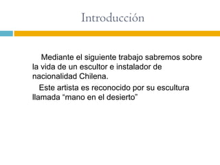 Mario Irarrázaval es un escultor chileno nacido en 1940 en Santiago. Estudió en Notre Dame y Italia antes de convertirse en un reconocido escultor, ganando premios como el Premio Salomón de Valparaíso. Es conocido por su escultura "Mano en el Desierto" de 1992, ubicada en el desierto de Atacama. Irarrázaval cree que la escultura sirve para comunicarse con la sociedad y liberarse a través del arte.