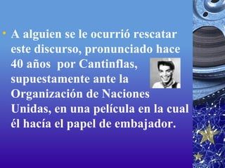 El resumen resume el discurso de Cantinflas ante la ONU. En 3 oraciones dice que Cantinflas no apoyará a ninguno de los dos bandos (Verdes u Colorados) debido a que los procedimientos de ambos no son perfectos y ninguno debería imponer su voluntad sobre los demás. Pide en cambio que se respeten las ideas de cada quien y se ayude a los países débiles de forma equitativa.