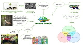 El documento presenta una introducción a la educación ambiental. Explica que la educación ambiental permite a las personas comprender su interdependencia con el entorno y que surgió de la Conferencia de Estocolmo de 1972, la cual originó el Programa Internacional de Educación Ambiental en 1975. Los objetivos de la educación ambiental son crear conciencia ambiental y contribuir al desarrollo sostenible, cubriendo ámbitos formales como escuelas e informales como la educación ambiental.