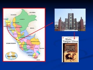 Este documento presenta una breve biografía y lista de obras del escritor peruano Mario Vargas Llosa. Proporciona información sobre su fecha y lugar de nacimiento, su educación y algunas de sus novelas más importantes como La Ciudad y los Perros, La casa verde, Conversación en La Catedral y Pantaleón y las visitadoras, las cuales exploran temas como la corrupción y la Amazonía peruana.