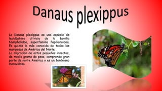 La mariposa monarca realiza largas migraciones anuales entre Canadá, Estados Unidos y México. Se alimenta principalmente de plantas venenosas como el algodoncillo que le proporcionan protección contra depredadores. Su ciclo de vida incluye cuatro etapas y su hábitat cambia dependiendo de si se encuentra en América del Norte o en los santuarios de México durante el invierno.
