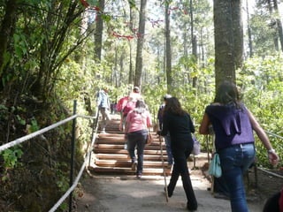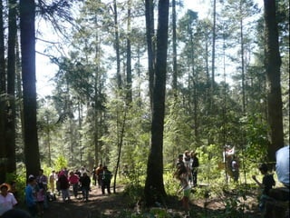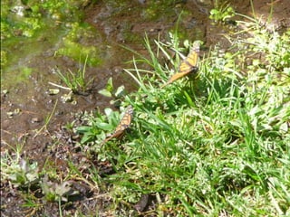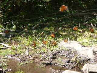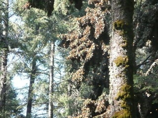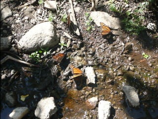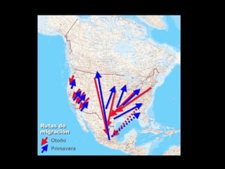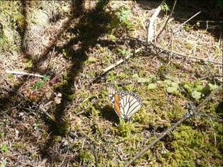 El documento describe la migración anual de las mariposas monarca a los bosques de oyamel en México para hibernar. Millones de mariposas viajan miles de kilómetros desde Canadá y los Estados Unidos hasta los santuarios en México, donde se congregan en los árboles para sobrevivir el invierno. En la primavera, la nueva generación emprende el vuelo de regreso al norte.
