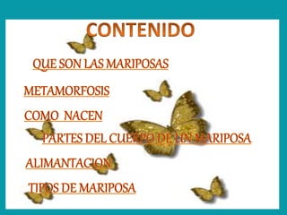 Este documento describe las diferentes etapas de desarrollo de las mariposas, desde el huevo hasta la mariposa adulta. También menciona algunas especies de mariposas notables como la mariposa monarca, que migra miles de kilómetros, y la mariposa ojo de pavo, conocida por sus alas verdes con motivos oculares. Además, proporciona los nombres científicos y detalles sobre varias mariposas, incluidas sus características, hábitats y comportamientos.