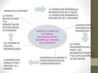 Este documento presenta un resumen de cuatro módulos sobre el desarrollo humano desde perspectivas socioculturales, científicas y educativas. Explora temas como la naturaleza vs. la crianza, los modelos de desarrollo psicológico, y el papel de la educación. También analiza factores como la migración y la pobreza que afectan el desarrollo infantil en México y cómo la escuela e instituciones educativas pueden promover el desarrollo humano.