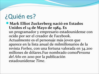 Mark Zuckerberg, nacido en 1984 en Estados Unidos, es el programador y empresario conocido por crear la red social Facebook en 2004 mientras estudiaba en la Universidad de Harvard. Facebook ha crecido exponencialmente para convertirse en la red social más grande del mundo con más de 1350 millones de usuarios en todo el mundo. Aunque Zuckerberg es el fundador principal, Facebook también fue fundado por Eduardo Saverin, Chris Hughes y Dustin Moskovitz.