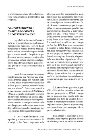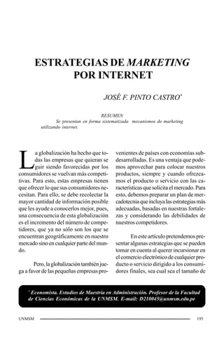 Este documento presenta estrategias de marketing utilizando internet. Describe seis tipos de usuarios de internet y sus hábitos de compra. También cubre estrategias de segmentación del mercado meta, desarrollo de productos, precios y distribución para el comercio electrónico.