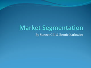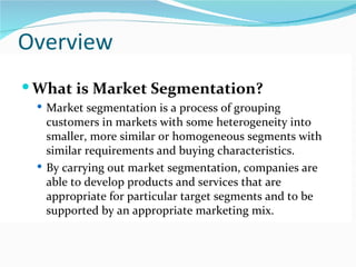 Market segmentation involves grouping customers into segments based on similarities to better target them. It is the first of three key steps in developing a marketing strategy along with targeting and positioning. Effective segmentation criteria include segments being identifiable, accessible, sizable, profitable, with unique needs and durable over time. Segmentation allows companies to tailor products and marketing approaches to specific groups. Common bases for segmentation include geographic, demographic, psychographic and behavioral factors.