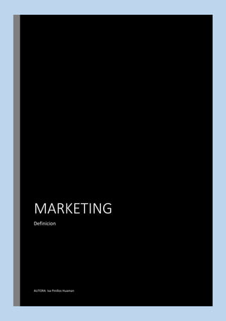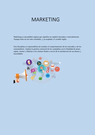 Este documento define marketing como la disciplina que estudia el comportamiento de los mercados y consumidores para atraer, captar y fidelizar clientes a través de satisfacer sus deseos y necesidades. Explica que el marketing se enfoca en 4 áreas clave: el producto o servicio, la distribución, el precio y la promoción. Cada área es importante para posicionar el producto de manera estratégica y satisfacer las necesidades de los consumidores.