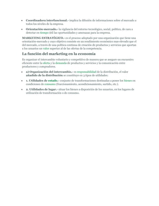 El documento define y explica varios conceptos clave relacionados con el marketing estratégico y operativo. El marketing estratégico implica un análisis sistemático de las necesidades del mercado para desarrollar productos rentables que satisfagan necesidades específicas y proporcionen una ventaja competitiva sostenible. El marketing operativo se enfoca en estrategias tácticas de ventas y comunicación para dar a conocer las cualidades de los productos y reducir los costos de adquisición de clientes. El documento también describe la función del marketing en la economía de