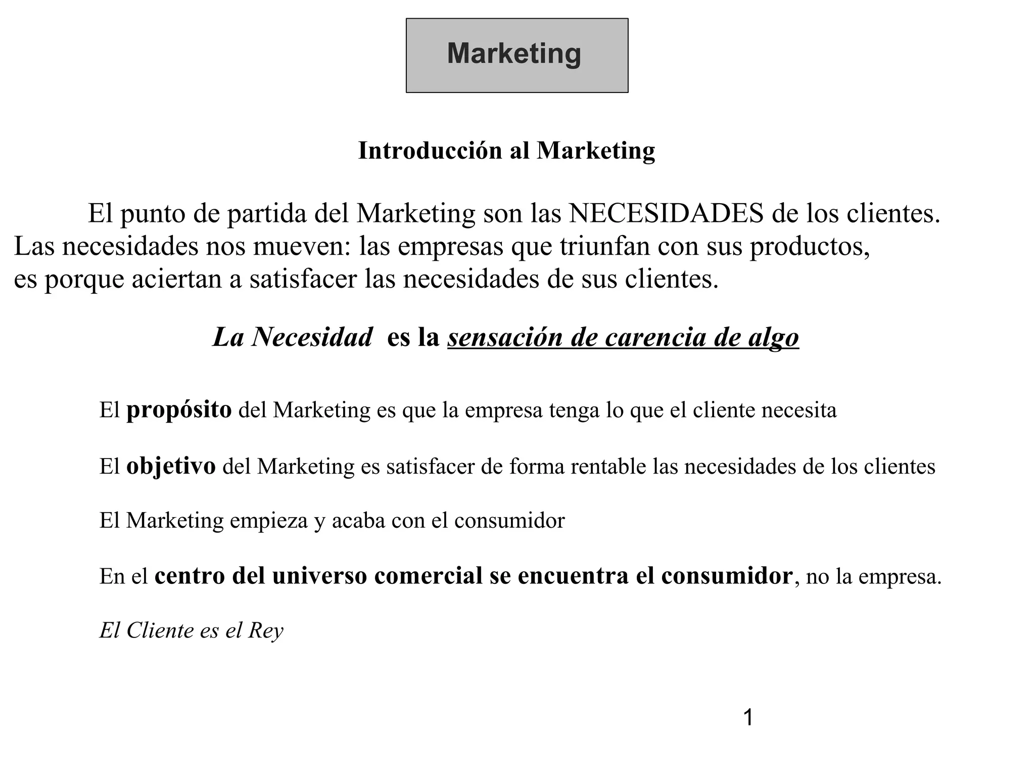 Este documento introduce los conceptos fundamentales del marketing, incluyendo que el punto de partida del marketing son las necesidades de los clientes, que el objetivo del marketing es satisfacer de forma rentable las necesidades de los clientes, y que el cliente está en el centro del universo comercial. También define el marketing como una función técnica que consiste en elegir a quién, qué y cómo vender para satisfacer las necesidades del consumidor de forma rentable.
