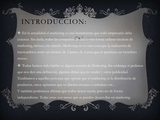 El documento introduce el concepto de marketing, explicando que implica realizar intercambios mutuamente beneficiosos entre dos partes. Describe los enfoques tradicionales orientados al producto frente a los enfoques modernos orientados al consumidor. Explica las funciones clave del marketing, incluyendo investigación de mercado, desarrollo de producto, fijación de precios, distribución, y promoción, que comprenden el marketing mix de las 4P's: producto, plaza, promoción y precio.