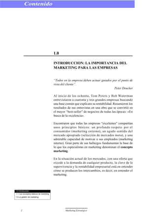 Este documento presenta los conceptos básicos de marketing. Explica que el marketing es un proceso social y de gestión a través del cual los individuos y grupos satisfacen sus necesidades creando, ofreciendo e intercambiando productos de valor. Define conceptos clave como necesidades, deseos, demandas, productos, valor, coste y satisfacción. También describe los componentes de la gestión de marketing como el proceso de marketing y sus elementos estratégicos y operativos. El objetivo es que los participantes comprendan la importancia de aplicar los conceptos de marketing