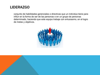 El documento define el liderazgo como el conjunto de habilidades gerenciales que una persona usa para influir en un grupo y motivarlos a lograr metas de manera entusiasta. Explica que los líderes circunstanciales asumen autoridad temporalmente, mientras que un líder efectivo se desarrolla a sí mismo primero y mejora habilidades como la motivación y la confianza. También cubre diferentes tipos de líderes como los de opinión y los de medios.