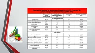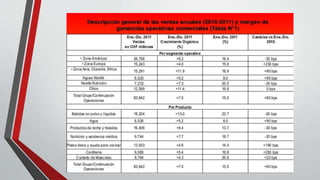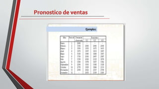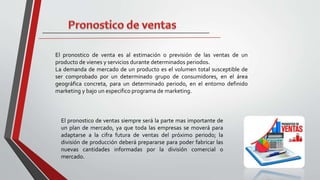 Este documento resume los métodos para pronosticar las ventas, incluyendo métodos cualitativos basados en la opinión de ejecutivos y métodos cuantitativos basados en datos históricos. También presenta ejemplos de pronósticos de ventas realizados por una empresa de alimentos para los años 2010-2011 y 2013, proyectando un crecimiento del 5% para 2016.