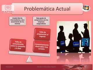 El documento describe un estudio de mercado realizado por MAPFRE para analizar su situación actual, objetivos e información necesaria. Se requiere información interna como ventas de pólizas y comisiones, e información externa de la Superintendencia de Valores y Seguros además de focus groups y encuestas para diseñar una investigación exploratoria y concluyente.