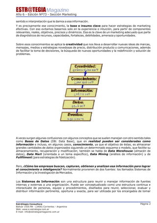 Este documento discute la importancia de aplicar la creatividad en todas las áreas del marketing basándose en un sólido conocimiento. Explica que los sistemas de información y la investigación de mercados son fundamentales para obtener datos e información que puedan transformarse en conocimiento útil. El conocimiento es la base para el desarrollo de estrategias creativas de marketing efectivas que permitan a las empresas aprovechar oportunidades y adaptarse a los cambios.