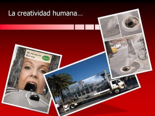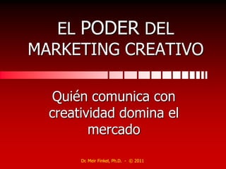El documento habla sobre el poder del marketing creativo. Explica que la creatividad humana puede cambiar la realidad exterior del consumidor y que el marketing creativo tiene la capacidad de comunicar sin palabras a través de imágenes y símbolos. También discute el poder de persuasión que puede tener el marketing creativo al modificar conductas y hábitos de consumo.