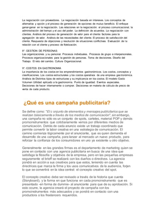 El documento trata sobre varios temas relacionados con la gastronomía y la gestión de empresas gastronómicas. Incluye secciones sobre fundamentos de gestión y marketing gastronómico, la gastronomía en el contexto económico y social actual, calidad bromatológica en alimentos, calidad de servicio, antropología gastronómica, el espacio gastronómico, negociación con clientes y proveedores, gestión de personas y costos en gastronomía.