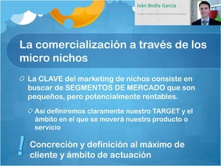 Este documento describe el marketing de nichos y micro nichos. Explica que se debe buscar segmentos de mercado pequeños pero rentables, definir claramente el público objetivo y ámbito del producto o servicio. También recomienda investigar bien las necesidades de los consumidores para crear una oferta que resuelva problemas insatisfechos. Finalmente, señala que el marketing de nichos es una buena opción para emprendedores y que en Internet hay menos competencia y bajos costos de publicidad para llegar al nicho.