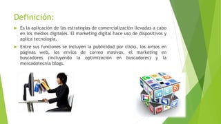 El documento define el marketing digital como la aplicación de estrategias de comercialización en medios digitales usando tecnología e incluye publicidad en línea, correo electrónico masivo y optimización en buscadores. Describe cinco tipos de marketing digital - contenido, inbound, relacional, conversacional y permiso - y nueve herramientas como posicionamiento en buscadores, publicidad paga, afiliados, viral y micrositios.