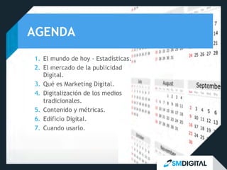 Este documento presenta una introducción al marketing digital. Explica que el mundo de hoy está dominado por Internet y los dispositivos móviles, fragmentando los medios tradicionales. También describe el rápido crecimiento del mercado de la publicidad digital y cómo los medios tradicionales se están digitalizando. Resalta la importancia de generar contenido valioso para las marcas en la era del marketing digital.