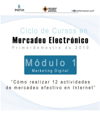 Este documento presenta la información sobre un curso práctico de marketing en Internet que se llevará a cabo en Bogotá, Colombia. El curso enseñará estrategias de mercadeo digital como posicionamiento en buscadores, email marketing, redes sociales y análisis web. El curso durará 12 horas durante dos días y será impartido por un experto en negocios electrónicos.