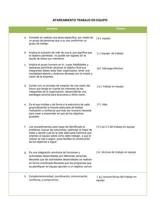 El documento describe los conceptos clave del trabajo en equipo. Explica que el trabajo en equipo implica realizar una tarea a través de un grupo de personas (equipo de trabajo) donde cada miembro aporta sus habilidades para alcanzar un objetivo común. Señala que el liderazgo efectivo, las técnicas de trabajo en equipo y las 5 C del trabajo en equipo (complementariedad, coordinación, comunicación, confianza y compromiso) son fundamentales para el éxito del equipo.