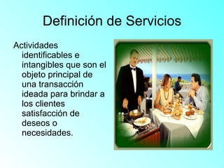 El documento habla sobre el marketing de servicios. Define los servicios como actividades intangibles que satisfacen las necesidades de los clientes. Explica que los servicios se clasifican de acuerdo a si se comercializan junto con bienes o si apoyan la venta de otros bienes o servicios. También describe las diferentes esferas en las que operan las organizaciones de servicios y sus características como la intangibilidad. Finalmente, cubre temas como la selección de mercados objetivo, la planificación del producto, la asignación de precios, los sist