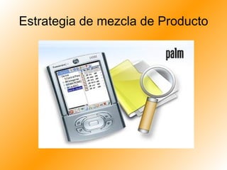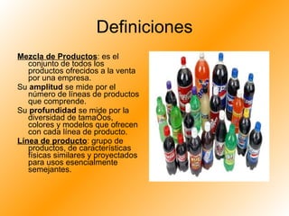 Este documento describe las estrategias de mezcla de productos que una empresa puede implementar. Explica conceptos como línea de producto, posicionamiento del producto, expansión, alteración y contracción de la mezcla de productos. También describe el ciclo de vida de un producto y las estrategias que una empresa puede usar en cada etapa, como crear una posición dominante en la entrada al mercado, realizar mejoras durante la fase de crecimiento y modificar el producto en la madurez.
