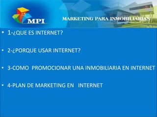 El documento detalla estrategias de marketing inmobiliario en internet, enfatizando la importancia de tener un sitio web bien diseñado y estratégico para atraer y convertir clientes. Se abordan aspectos clave como la promoción efectiva a través de SEO, PPC y el uso de redes sociales para maximizar la visibilidad. Además, se destacan las necesidades del consumidor actual y la importancia de generar confianza a través de contenido relevante y usabilidad en los sitios web.