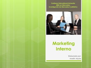 El documento presenta los resultados de una investigación sobre marketing interno en una empresa. Se entrevistó a un empleado para evaluar factores como el clima organizacional, comunicación, oportunidades de crecimiento y compromiso. Los resultados mostraron que los empleados se sienten comprometidos pero ven pocas oportunidades de avance. Reconocen premios por buen trabajo pero desean más motivación. Conocen los objetivos pero ven deficiencias en la comunicación. Se necesita mejorar la motivación de los empleados y fortalecer la comunicación para aumentar su
