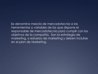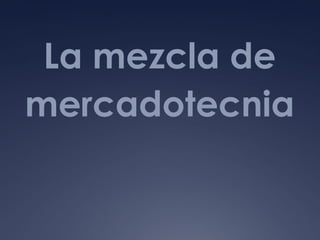 La mezcla de mercadotecnia (marketing mix) se refiere a las herramientas tácticas que una empresa puede controlar para influir en la demanda, como el producto, precio, plaza y promoción. La mezcla de mercadotecnia fue desarrollada en la década de 1950 y se consolidó en 1960 con las cuatro P clásicas. Estas herramientas tácticas permiten que una empresa llegue al mercado con un producto que satisfaga necesidades a un precio adecuado a través de un sistema de distribución y mensaje