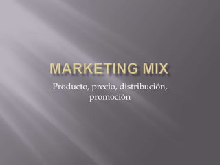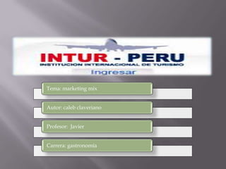 El documento presenta un resumen del marketing mix de Jara's Restaurant. Ofrece tres tipos de menús (simple, especial y a la carta) dirigidos a universitarios, trabajadores y el público en general, con precios entre $4-12. La distribución incluye clientes en el local, hospedajes cercanos, y pedidos para llevar. La promoción se realiza a través de la atención al cliente, la fachada, redes sociales, y letreros con la oferta.