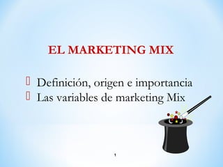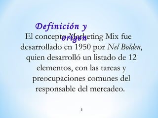 El documento describe la evolución del concepto de marketing mix desde su origen en 1950 hasta su definición actual de las 4 Ps (producto, precio, plaza y promoción). Explica que el marketing estratégico implica analizar el mercado, diagnosticar la posición competitiva y elegir una estrategia, mientras que el marketing operativo se refiere a la implementación táctica del plan de marketing a través de las 4Ps.