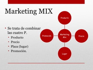 Este documento resume los elementos clave del marketing mix para analizar un portafolio de productos. Explica que el marketing mix consta de las 4 P: producto, precio, plaza y promoción. Detalla consideraciones para cada elemento como objetivos de producto, métodos de fijación de precios, canales de distribución y tipos de promoción. Concluye explicando la matriz de Ansoff para estrategias de producto y mercado.